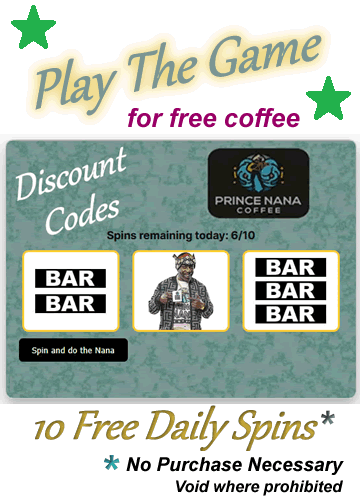 Get free coffee or a discount code today! Prince Nana invites you to spin & do the Nana! You can get a free discount code for a future order or even a free bag of coffee that’s placed right in the cart the moment you win! No purchase necessary. Void where prohibited.